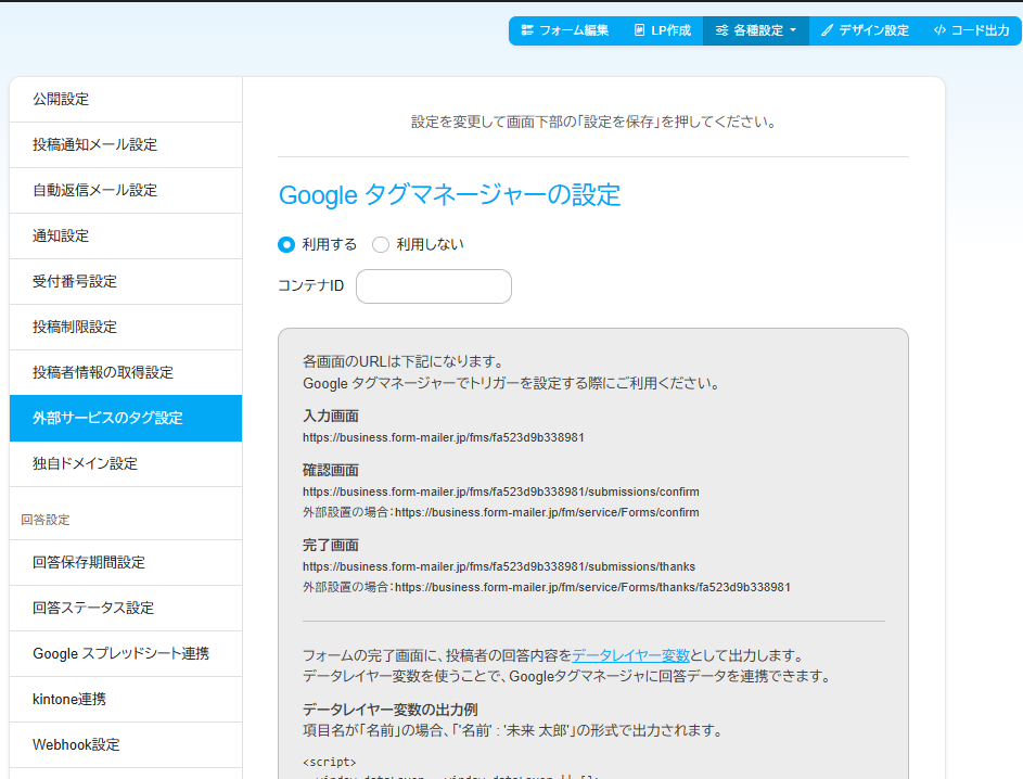 「各種設定」→「外部サービスのタグ設定」→「Google タグマネージャーの設定」の「利用する」をチェックして、「コンテナID」を設定してください。