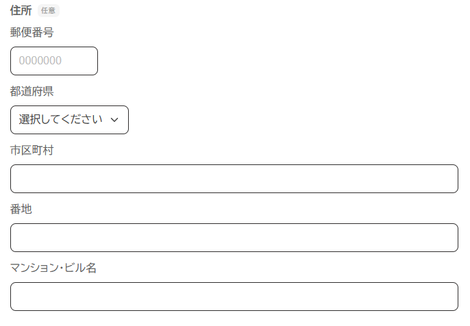 郵便番号、都道府県、市区町村、番地、マンション・ビル名入力欄がセット化されています。