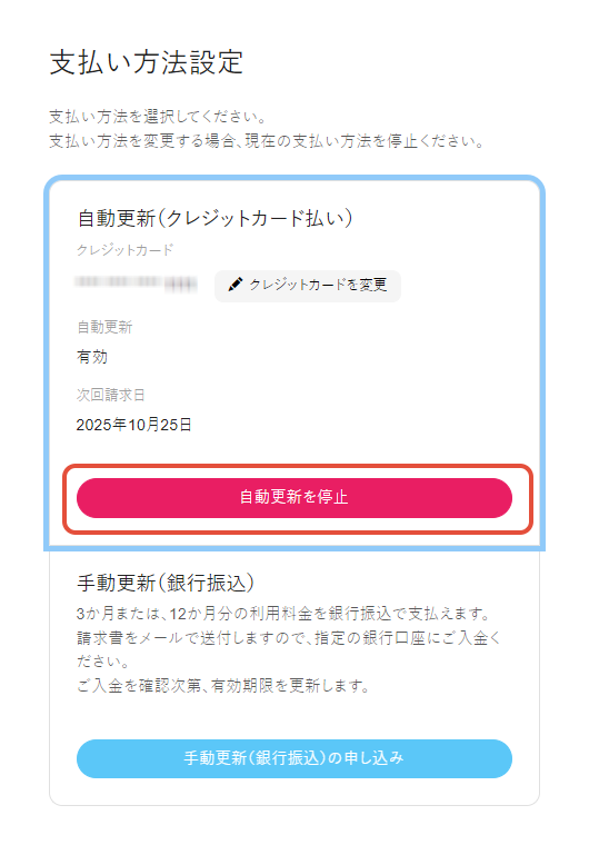 - 手動更新 (銀行振込) / 支払い方法が未設定・解除された / 無料トライアル中