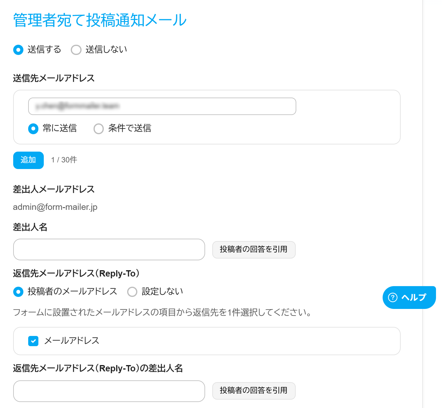 | 返信先メールアドレス(Reply-to) | 投稿通知メールへの返信先を設定します | 返信したい場合は「投稿者のメールアドレス」を設定 「返信先アドレス(Reply-To)」とはなんですか? |