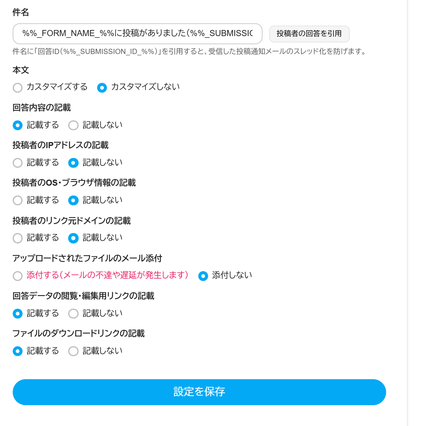 キーワード:管理者宛メール、投稿通知メール、通知メール、送信先、差出人名、返信先メールアドレス、Reply-to、件名、本文カスタマイズ、複数アドレス、ファイル添付、ダウンロードリンク、回答閲覧リンク、IPアドレス、ブラウザ情報、メールが届かない、送信先変更、投稿があったらメールが欲しい